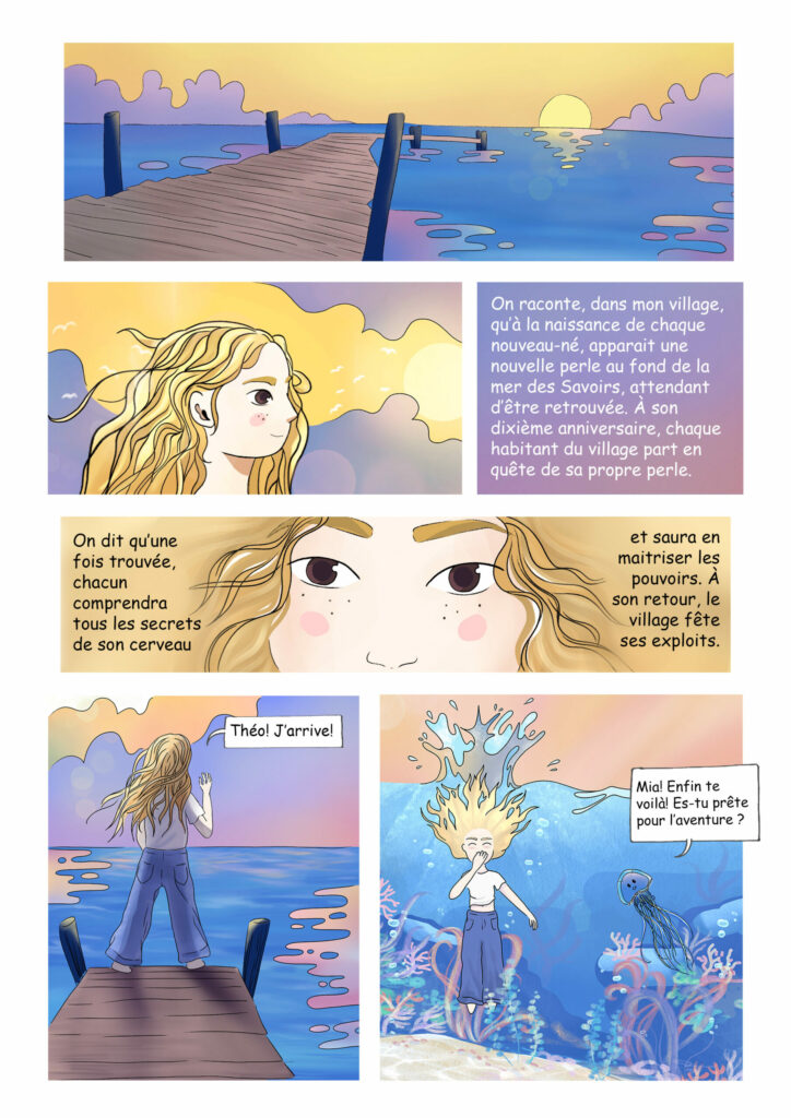 On raconte qu’à la naissance de chaque nouveau-né, apparait une nouvelle perle au fond de la mer des Savoirs, attendant d’être retrouvée. À son dixième anniversaire, chaque habitant du village part à la quête de sa propre perle, qui lui permettra de comprendre tous les secrets de son cerveau et d’en maitriser les pouvoirs. C’est ainsi qu’à ses dix ans Mia, accompagnée de Théo, son compagnon de voyage, part à l’aventure.